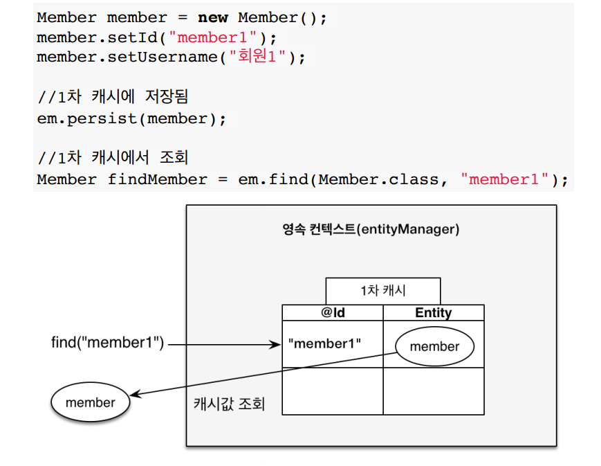 만약 DB에는 "member2" 라는 값이 있지만 1차 캐시에 존재하지 않는다면 DB에서 해당 값을 조회 후 , 1차 캐시에 저장한다. 그리고 1차 캐시에서 해당 값을 반환한다.