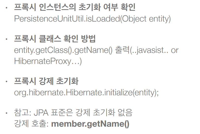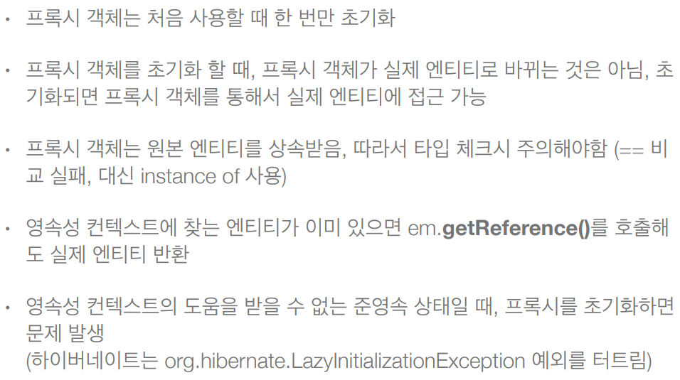 타입 체크 시 , 같은 객체를 조회해도 em.find 와 em.Reference(Proxy) 객체 값이 차이가 있기 때문에 값은 같더라도 다르다고 나오게 된다. -> instanceof 로 비교.