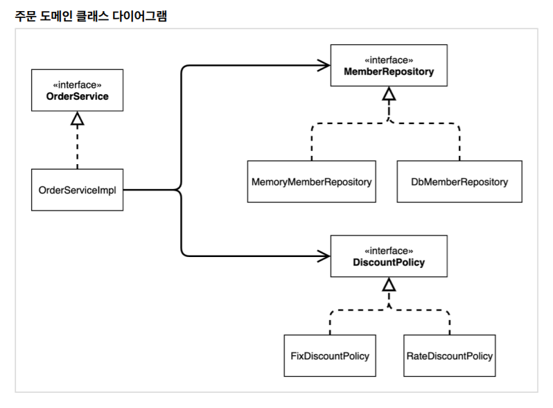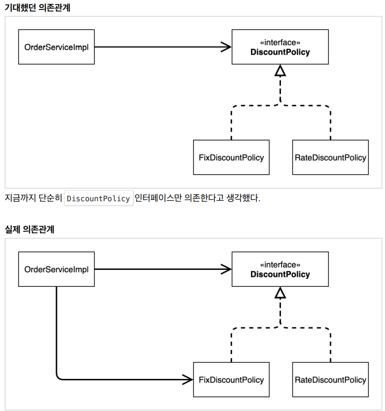 로 끝나야 한다. 만약 private final DiscountPolicy discountPolicy 처럼 바꾼다면 discountPolicy 는 어느 객체를 의존하고 있는지 알 수 없다. ( 해당 코드를 실행하면 Null Pointer Exception 발생)