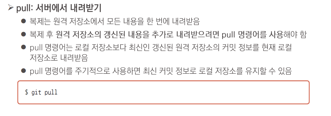 이미 원격 저장소의 파일을 clone 을 통해 다운받은 이후 라면 , pull 을 통해 갱신된 내용만 추가로 내려받을 수 있다.