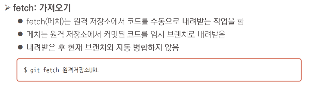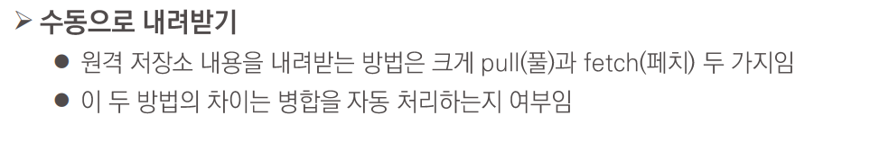원격 저장소의 내용을 내려받는 방법은 pull , fetch 두 개가 존재한다.