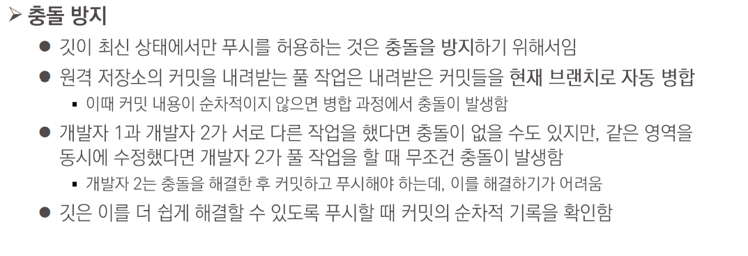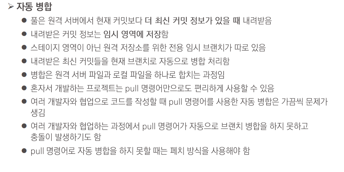 pull 은 자동으로 병합하기 때문에, 다른 개발자와 협업 하는 경우 충돌이 발생할 수 있다.