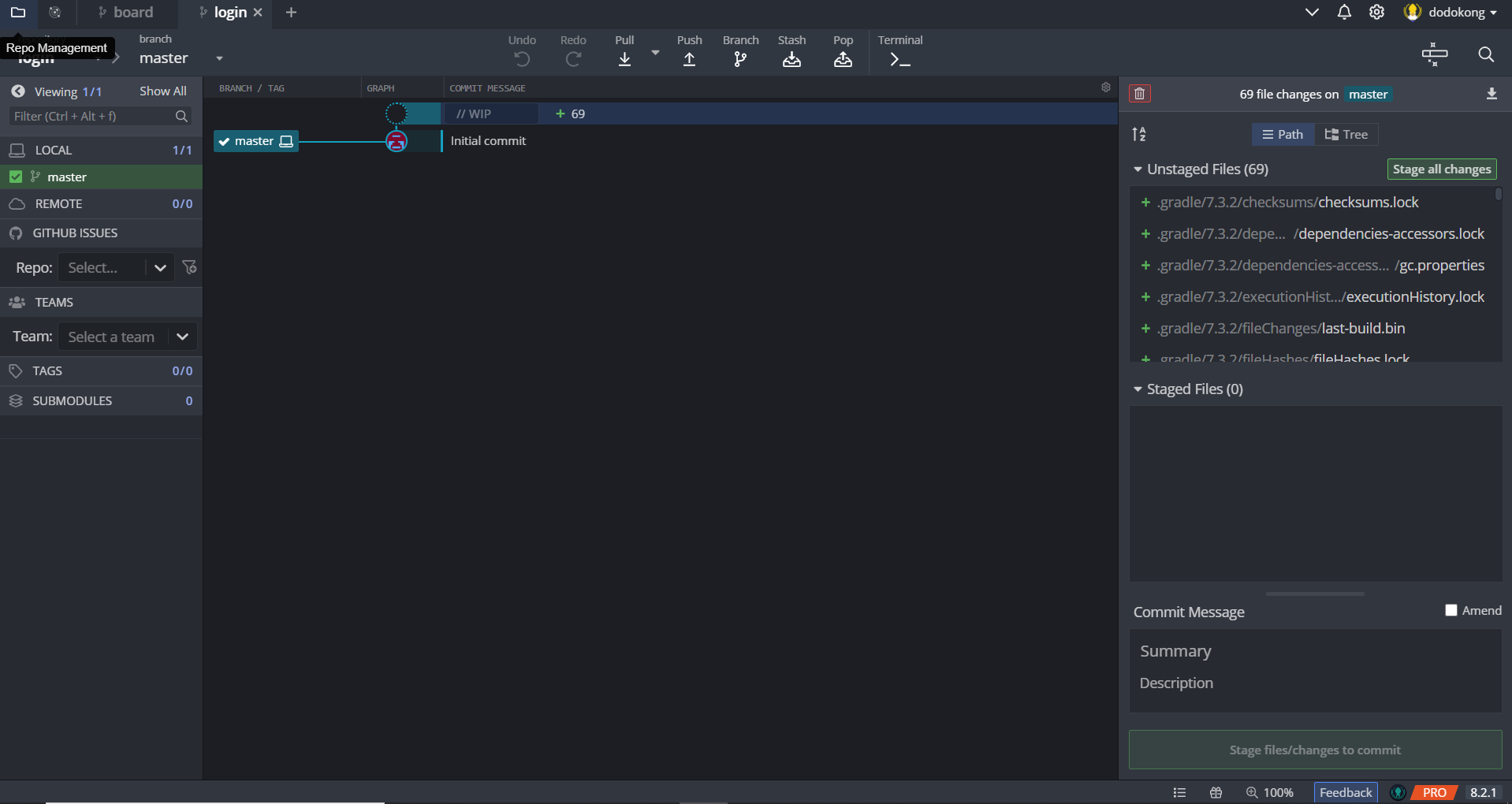 initial commit 을 요구합니다. 확인을 누르면 다음과 같은 화면이 생성되며, 내가 만든 파일들을 우측 stage 영역에서