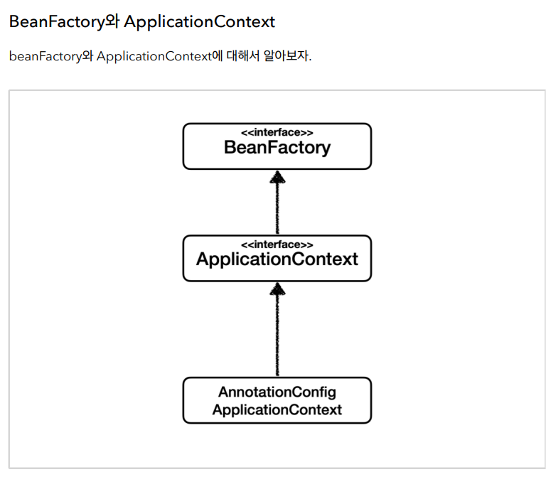 BeanFactory는 스프링 컨테이너의 최상위 인터페이스다. 스프링 빈을 관리하고 조회하는 역할을 담당하며 getBean 기능도 제공한다. 그럼에도 BeanFactory를 쓰지 않고 'ApplicationContext' 를 쓰는 이유는 수 많은 부가기능을 제공해 주기 때문이다.