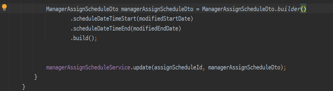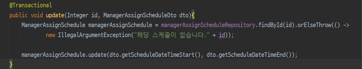 그리고 managerAssignSchedule.update(dto, dto)를 날려주면