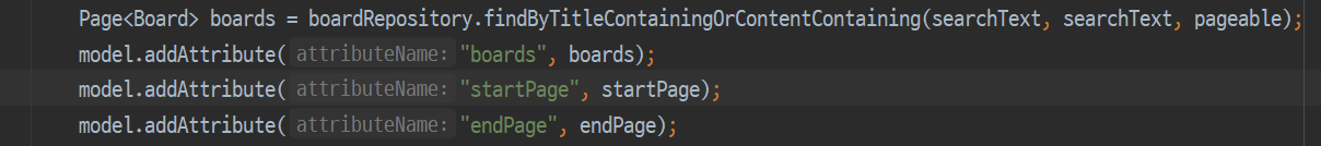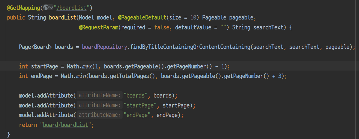 Controller 에서 String searchText 로 입력값을 받습니다.