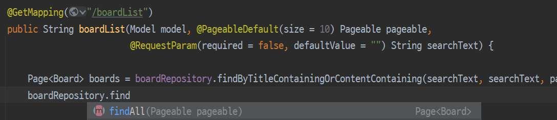 페이징을 하기 위해서는 Controller 의 매개변수에 Pageable pageable 속성을 넣고, 다음과 같이 선언하면 됩니다.