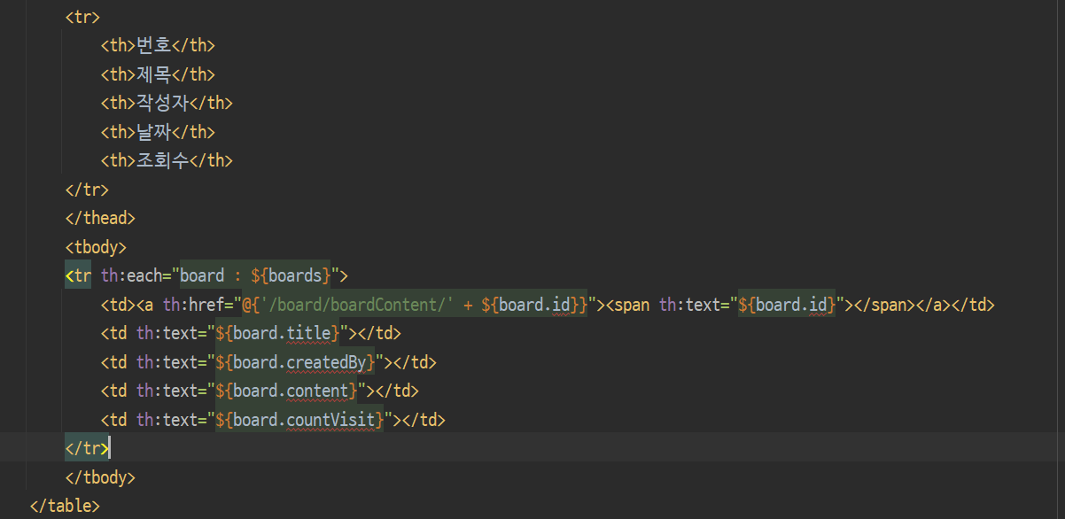 th:each 문을 이용해서 boards 에 담긴 값을 board 에 넣고,