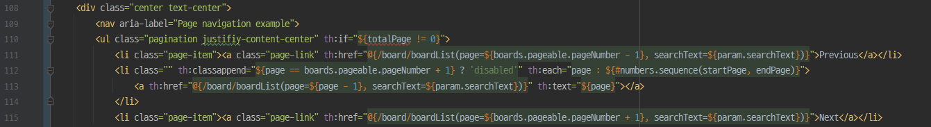 그 외의 111, 115 번째 줄은 boards.pageable.pageNumber 를 통해 현재 페이지 index 를 가져오고,