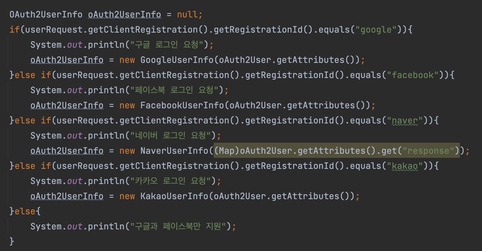 }else if(userRequest.getClientRegistration().getRegistrationId().equals("facebook")){