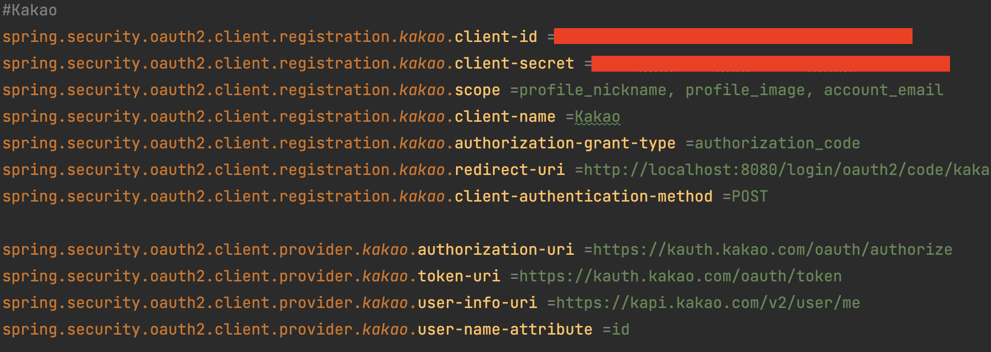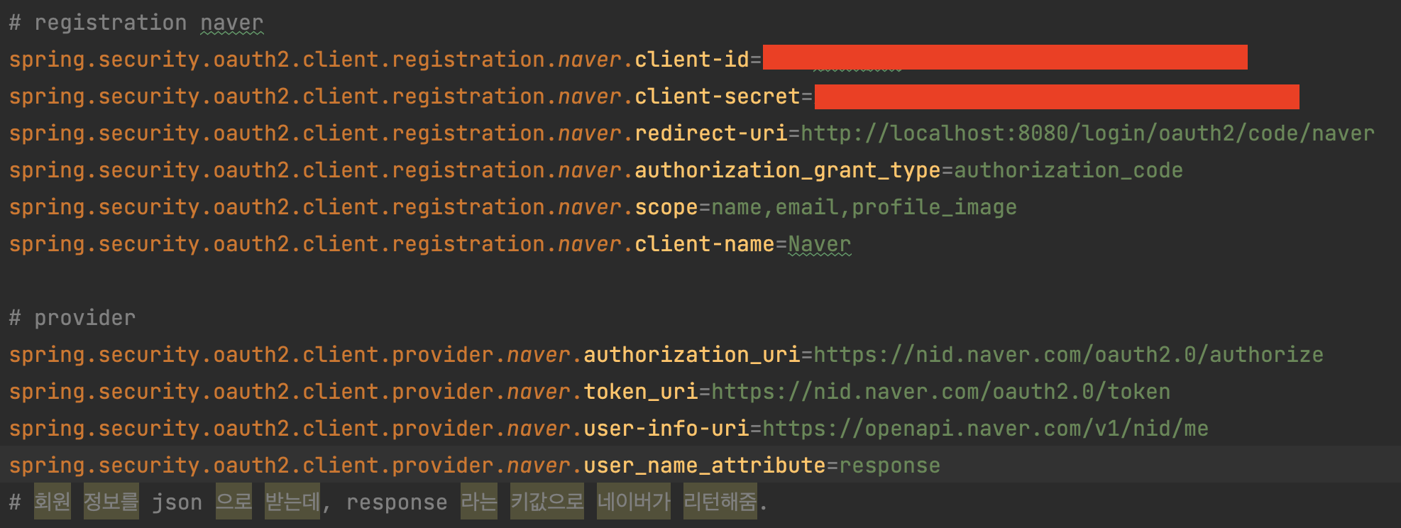 application.properties 에 본인의 클라이언트 id 와 패스워드를 등록하고!!