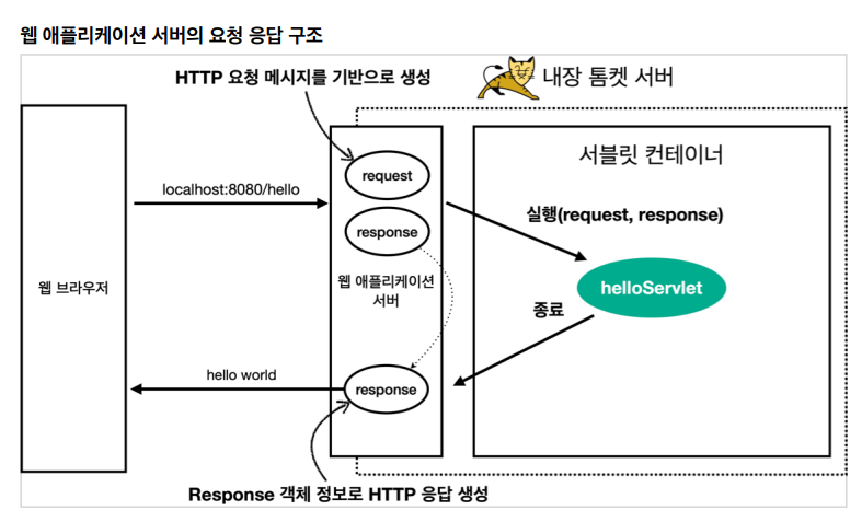 웹 브라우저로부터 요청이 들어오면 request 또는 response 를 통해 응답을 하는데 이를 위해 (HttpServletRequest request, HttpServletResponse response) 객체를 생성한다. 대표적인 서플릿 컨테이너로는 톰캣(Tomcat)이 있다.