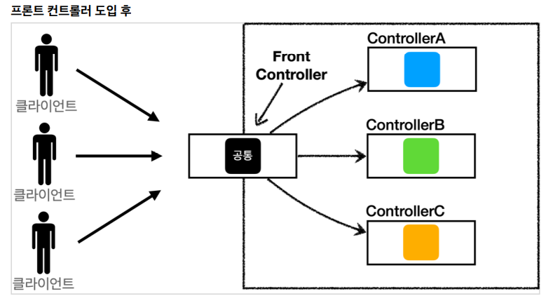 즉 공통 처리를 위해 Front Controller 가 생겨났다. 컨트롤러 호출 전에 공통 기능을 모두 처리해 준 후 , 각 Controller가 실행된다.