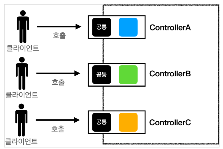기존의 컨트롤러는 HttpResponse response 처럼 사용하지 않는 코드가 존재하고, 코드의 중복이 너무 많으며 , 이로 인해 공통 처리가 어렵다.