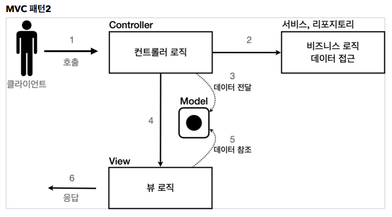 MVC 패턴은 지금까지 학습한 것 처럼 하나의 서블릿이나, JSP로 처리하던 것을 컨트롤러(Controller)와 뷰(View)라는 영역으로 서로 역할을 나눈 것을 말한다. 웹 애플리케이션은 보통 이 MVC 패턴을 사용한다.